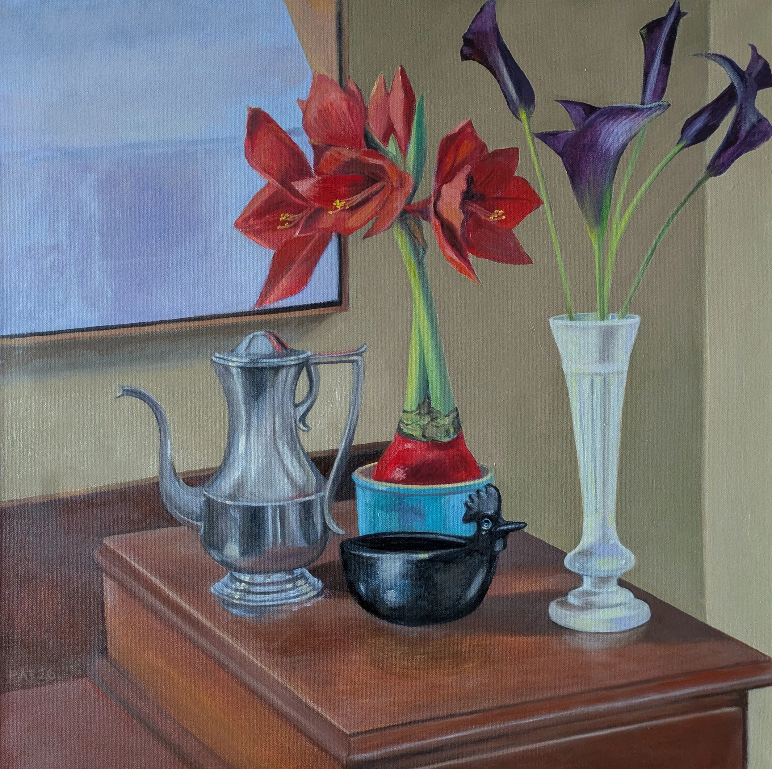 Amaryllis in January, 2026, oil on canvas, 24 x 24 inches